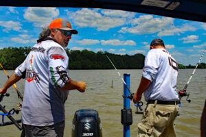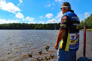 CrappieNOW Publisher, Dan “Crappie Dan” Dannemueller, prepares to set lines to troll crankbaits using Off Shore Tackle planer boards. “When the summer heat sets in, trolling crankbaits along creek channel ledges is a great way to target big crappie.” (Photo: Richard Simms, CrappieNOW Editor)