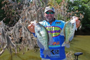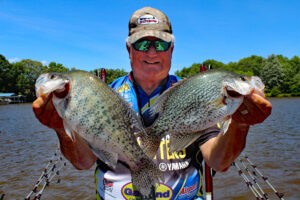 CrappieNOW Publisher, Dan “Crappie Dan” Dannemueller, with bragging-sized white and black crappie taken fishing the Alabama River near Wetumpka, Alabama. (Photo: Richard Simms, CrappieNOW Editor)