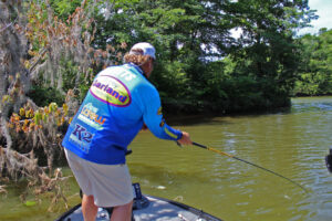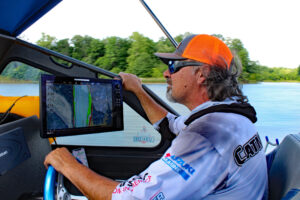 Guide Lee Pitts was also fishing “new water” during this foray on the Alabama River. But experience and his Humminbird Helix showed him where to find crappie. (Photo: Richard Simms, CrappieNOW Editor)