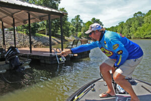 When the sun is shining bright, it is hard for Guide Lee Pitts to bypass a shaded dock near deep water without shooting a Bobby Garland jig under for crappie. Pitts is well-known as one of the premier dock-shooters in the guide business. (Photo: Richard Simms, CrappieNOW Editor)