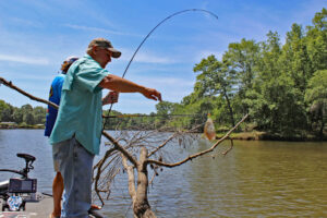 Guide Lee Pitts, a Bobby Garland Pro-Staffer, horses a hefty crappie out of an Alabama River treetop. (Photo: Richard Simms, CrappieNOW Editor)