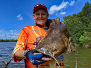 B’n’M Poles Pro Staffer Michael Haney shows off 40-pound flathead taken on the Alabama River using a Silver Cat Magnum pole here on the Alabama River in Elmore County. (Photo: Keith Sutton)