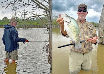 CrappieNOW Editor Richard Simms said chasing crappie in knee-deep water was an awesome "up-close-and-personal" experience. (Photo by Aaron Barton) ...