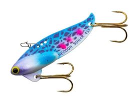 The Heddon Sonar, which first hit the market around 1959, was the original bladebait to gain widespread popularity, followed shortly by Cotton Cordell’s Gay Blade. Both these lures feature a design that mimics a baitfish, with a metal-blade body sandwiched between lead pieces forming the “head.” The blade includes multiple line-tie holes on its top edge, while double hooks or treble hooks dangle from the bottom.