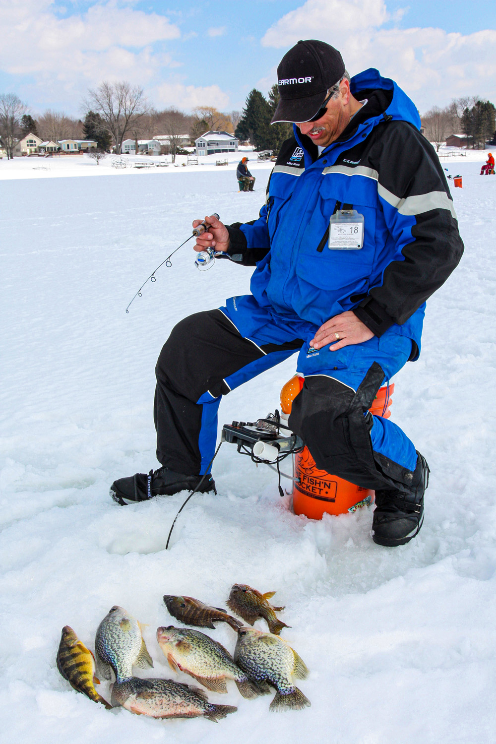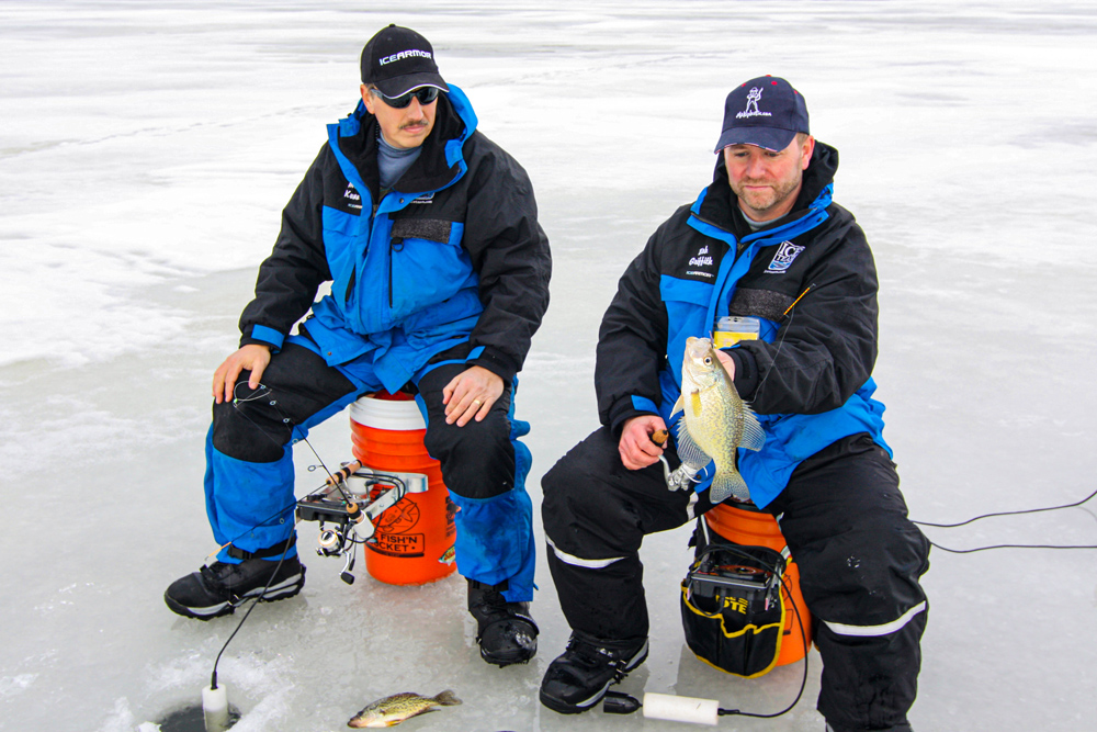 Mike Kuna and Bob Griffith enjoy of ice fishing for crappies on Lake Latonka in NW Pennsylvania. (Photo: Darl Black) - Apparel: Staying warm and comfortable is crucial. One option is to dress in layers cumulating in separate windproof outerwear jacket and bibs, thereby allowing the jacket to be removed if one begins to overheat. The other option is the one Glasgow prefers: a fully insulated flotation suit which keeps one afloat should the individual go through the ice. “Quality flotation suits are pricey for a novice just getting into ice fishing, but if you decide to get one, buy a top quality one like the Striker brand suit.” Glasgow suggests supplementing insulated snow boots with either battery-operated hot socks or chemical toe warming packs. A warm hat that covers the ears and a pair of insulated waterproof gloves complete the outfit.