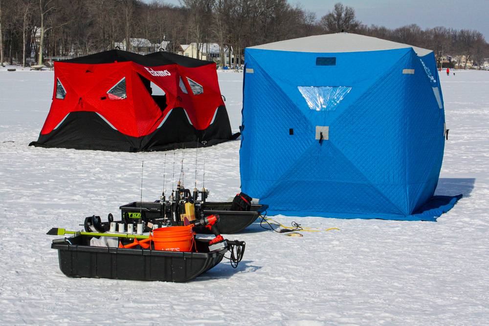 - Shelter: Intended to protect you from cold winds and blowing snow, ice shanties range from extremely portable one-person pop-ups to large expensive tents with room for 4 to 6 people. “I am always on the move checking new areas, so my shelter must be easily transported. I use Eskimo’s sled-style Sierra Thermal Shanty, which can be purchased for under $400,” states Glasgow. “However, as a beginner, you might skip a shelter and simply pick your fishing days carefully – only go on windless days when air temperature is in the 30’s. Shelter or not, I never go out without my Mr Heater Buddy heater.”
