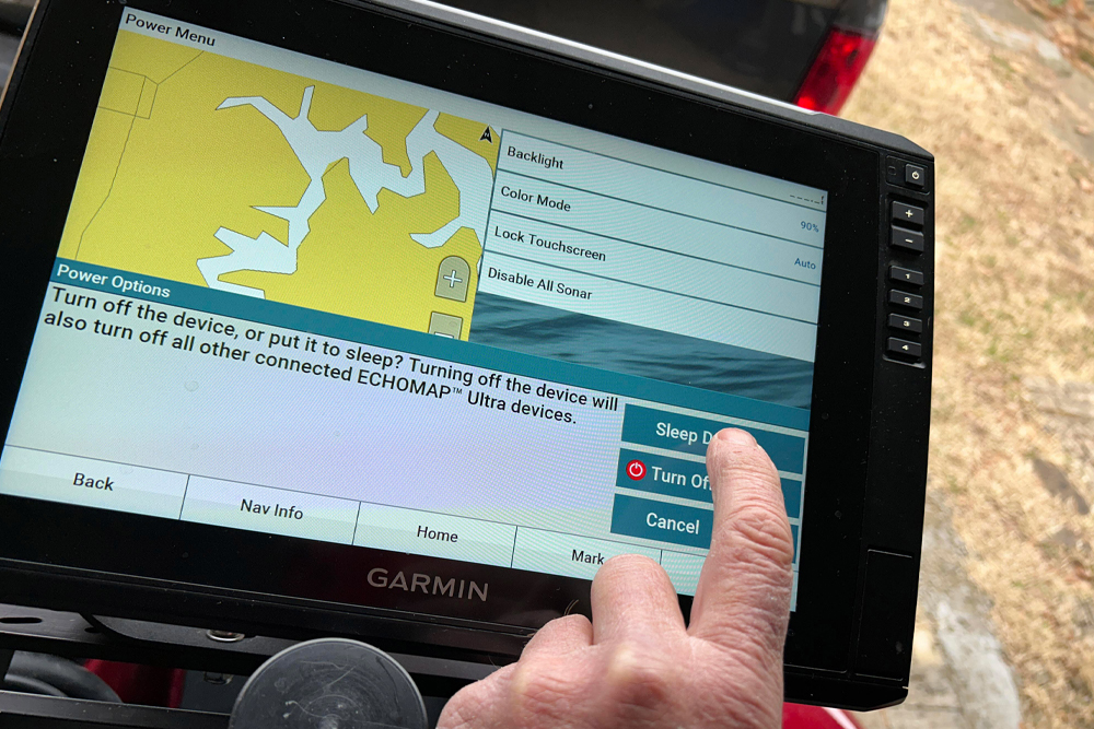 Garmin’s home screen allow an angler to put the unit in sleep mode to conserve power. (Photo: Brad Wiegmann)