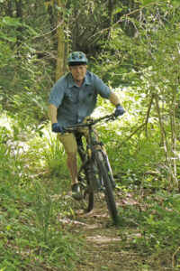 Mountain biker Robbie Broach enjoys the wooded trails at Swayback Bridge Trials. Visitors can hike or bike different trails to enjoy the outdoors in a quiet, peaceful environment. (Photo: Tim Huffman) Swayback Bridge Trails is a getaway for a hike, mountain bike ride, boat launch and canoeing. Hiking trails include 1-mile, 2.5, 4 and 7-miles. The trail was built in the 1990’s and much of the work today is by the River Region Mountain Bike Alliance. President Robbie Broach says trails now total about 11 miles and are flat and easy in front portions and become steeper closer to the lake. County Commissioner Desirae Lewis says, “These are trails where our citizens and visitors can come hike on a trail or ride a bike in an outdoor setting. It’s a fun, quiet recreational place to come.”