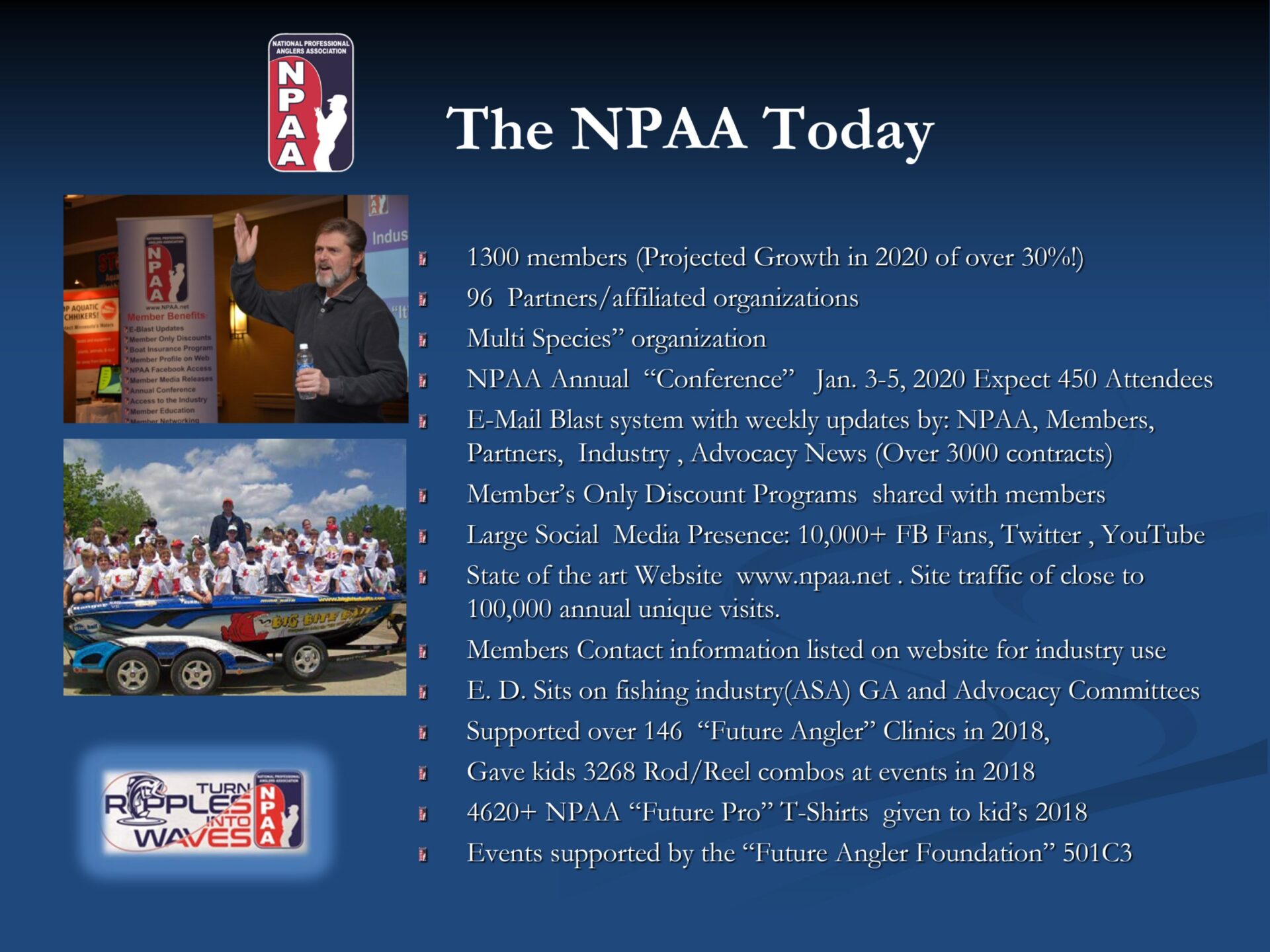 The NPAA’s mission is: To increase the professionalism of our members as we work to grow and protect sportfishing.